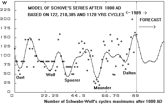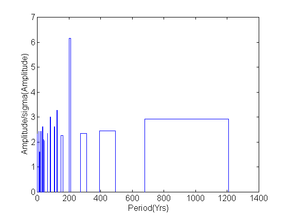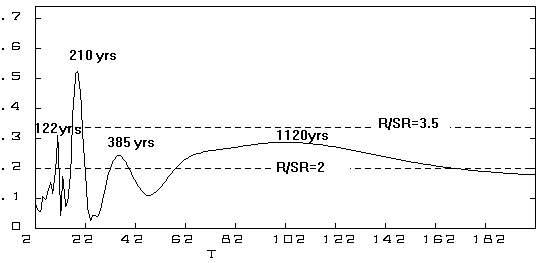 The T-R correlogramm of Schove's series /1000-1996 AD/. The main cycle is at T=210 years.