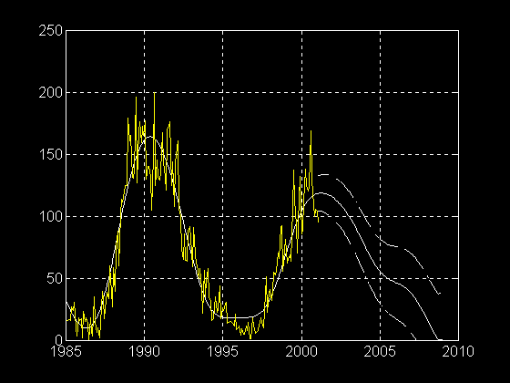 The forecast of the second half of the current 11 year solar cycle. This is a result of the analysis of the monthly mean International sunspot number Ri values obtained from 1750 to 2000 AD.