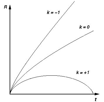 Figure: Three possible cosmological models. Plotted is the "scale factor" of the universe versus time. Models with density less than the critical density are open and expand forever. These are labeled k=-1 (hyperbolic geometry) and k=0 (flat geometry). Models with density greater than the critical density will recollapse. This model is labeled k=+1 (spherical geometry).