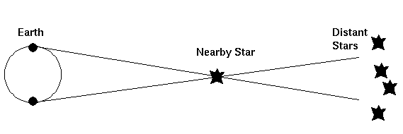 Now, given that, one can use the rules of trigonometry to determine the diameter of the Sun if one knows the distance, or one could determine the distance if one knew the diameter. But how does one determine a distance? In the case of the Sun it was done in the same manner that we determine distances here on the Earth: by the method of triangulation. It is of some historical interest to note that the size of the solar system was first measured by observing the planet Venus crossing over the face of the Sun (in 1761 and 1769) from several locations on the Earth and triangulating to obtain the distance from the Earth to Venus. (The observing expedition to Tahiti was led by Captain James Cook.) Anyway, the average distance from the Earth to the Sun is 150,000,000 kilometers (1.5 × 108). The angular diameter of the Sun is 32 arc minutes which is equal to about .009 radians of angle which means that the Sun is about 1.4 × 107 kilometers in diameter (about 110 times that of the Earth). Since in astronomy we most often refer to the radius of stars and planets, and we use the units of centimeters (cm), we shall note that the radius of the Sun is 7 × 1010 cm.