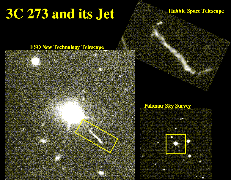 The first quasar identified and the brightest in apparent magnitude, 3C 273 is unusually luminous for being so nearby, and has by far the brightest optical jet known among quasars. This montage illustrates its appearance on Palomar Sky Survey plates, where a hint of the jet appears; on an excellent ground-based image, showing not only the jet but the fuzzy glow of the giant host galaxy around the brilliant nucleus; and an HST images detailing the complex structure of the jet itself with the nucleus safely outside the field of view. This jet is unique in its complex structure, with extensions to the side at both ends that have no radio counterparts. Indeed, unlike optical jets seen in radio galaxies, there are major differences between the radio and optical structures of this jet.