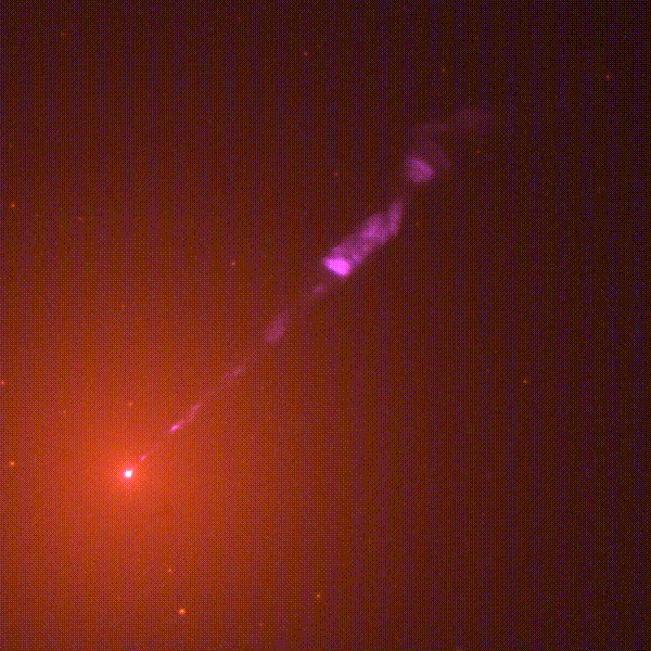 This image was provided by John Biretta. It is a color composite from stacked HST WFPC2 images in the near-UV and near-IR (at about 2900 and 8000 Angstroms), so the color mix isn't quite what a purely visual filter selection would produce. However, the color difference between the old stars dominating the galaxy and the bluer light of the jet (tending to violet in this rendition) is clear. The small objects scattered around the field of view are are a few of the thousands of globular star clusters in M87 itself.