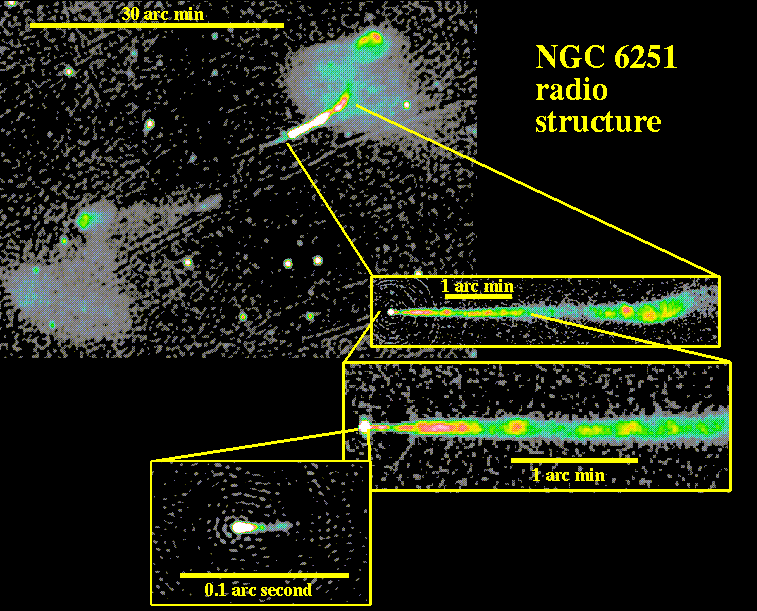 One important lesson from radio galaxies is that the central engine continues to eject material in nearly the same direction for at least several million years, based on the fact that the tiny parsec-scale jets in the core regions point in the same direction as the very extended radio structure which may stretch several million light-years (and thus took at least that many years to form). The nearby radio galaxy NGC 6251 is an excellent example. The largest structures are seen in a map made with the Westerbork Synthesis Array Telescope in the Netherlands, which can map somewhat larger objects than the VLA, working in this case at a wavelength of 49 cm. This image spans almost a full degree (56 arcminutes) east-to-west. Closing in toward the nucleus are two maps made with the VLA at 20 centimeters wavelengths, showing the extraordinary straight and narrow jet feeding toward the northwest radio lobe, spanning 308 and 188 arcseconds. Finally, the innermost core is shown in a VLBI map with a resolution of only 3 milliarcseconds (0.003 arcsecond), showing that knots are still moving outward from the nucleus in nearly the same direction. The VLA and VLBI maps have been rotated to make the jet horizontal for convenience. The WSRT map shows the faint counterjet opposite the bright jet; its weakness may indicate that the jet is in relativistic motion more or less toward us, so that Doppler boosting makes it appear dramatically brighter than its counterpart.